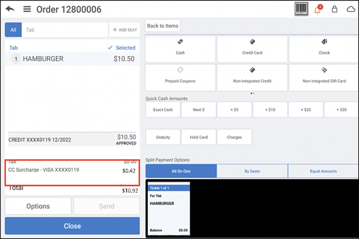 Note: In Table Service, the system advances to the next ticket for the table, or if there are no other checks to close for the table, the floor plan screen appears. In Quick Service, the order entry screen appears.